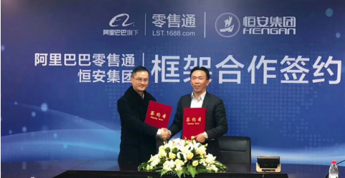 阿里巴巴集团副总裁、零售通事业部总经理林小海(左)与来利国际w66集团运营中心总裁许水深(右)签订战略合作协议